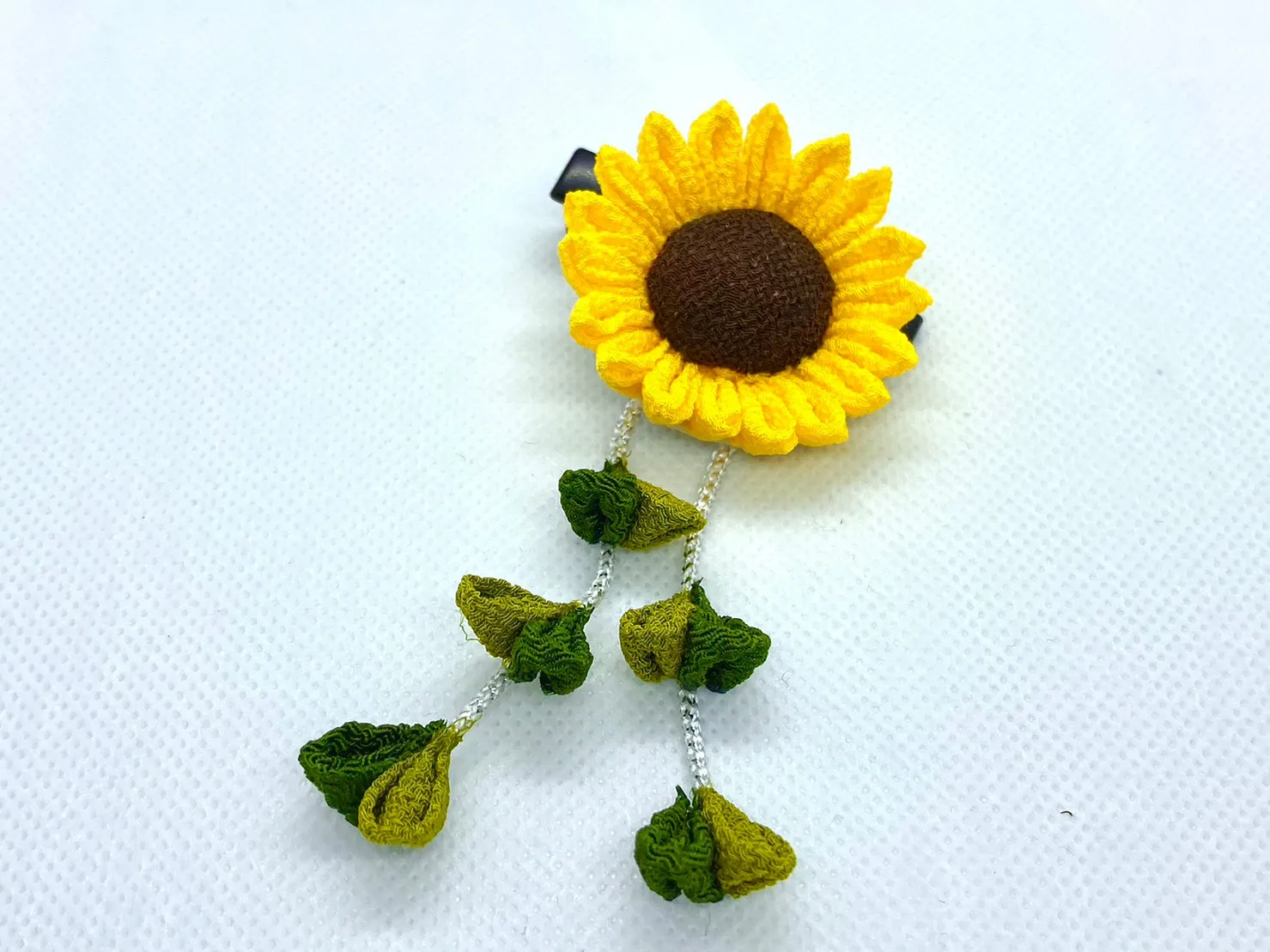 黄色と茶色のちりめん生地で作ったひまわりの髪飾りで す。浴衣着用時や、お子様にもオススメです。2本の葉の 下がりが動くたびに揺れます。2wayクリップ使用ですの で、浴衣帯に飾りとして留めてもとても可愛く仕上がりま す。
